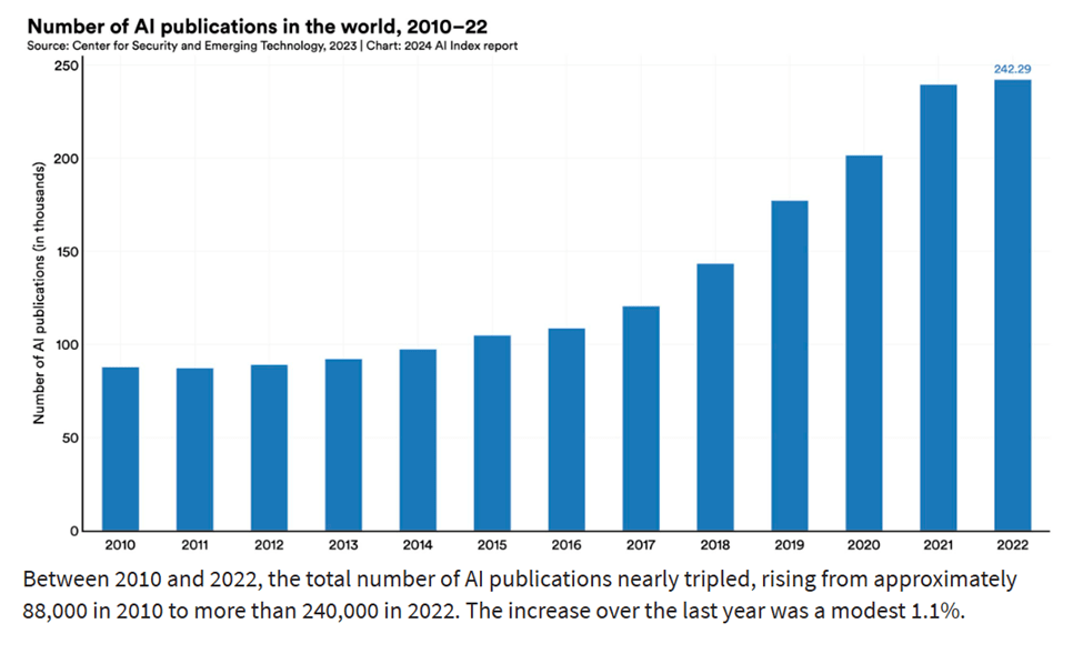 I looked into the AI Index report from Stanford today. PhD researchers like Ilya Sutskever published great academic papers like “Sequence to Sequence Learning with Neural Networks” in 2014. “Attention Is All You Need,” which introduced the Transformer architecture and attention mechanism (Thanks to google researchers), was published in June 2017. If you check out the graph below of academic publications, you do not feel the AI “wake-up call” happened in November 2022 after the release of ChatGPT-3.5 by OpenAI. Yes. Just look at the number of research publications in AI and see how academic researchers had a head start; universities could do better, but what happened?
